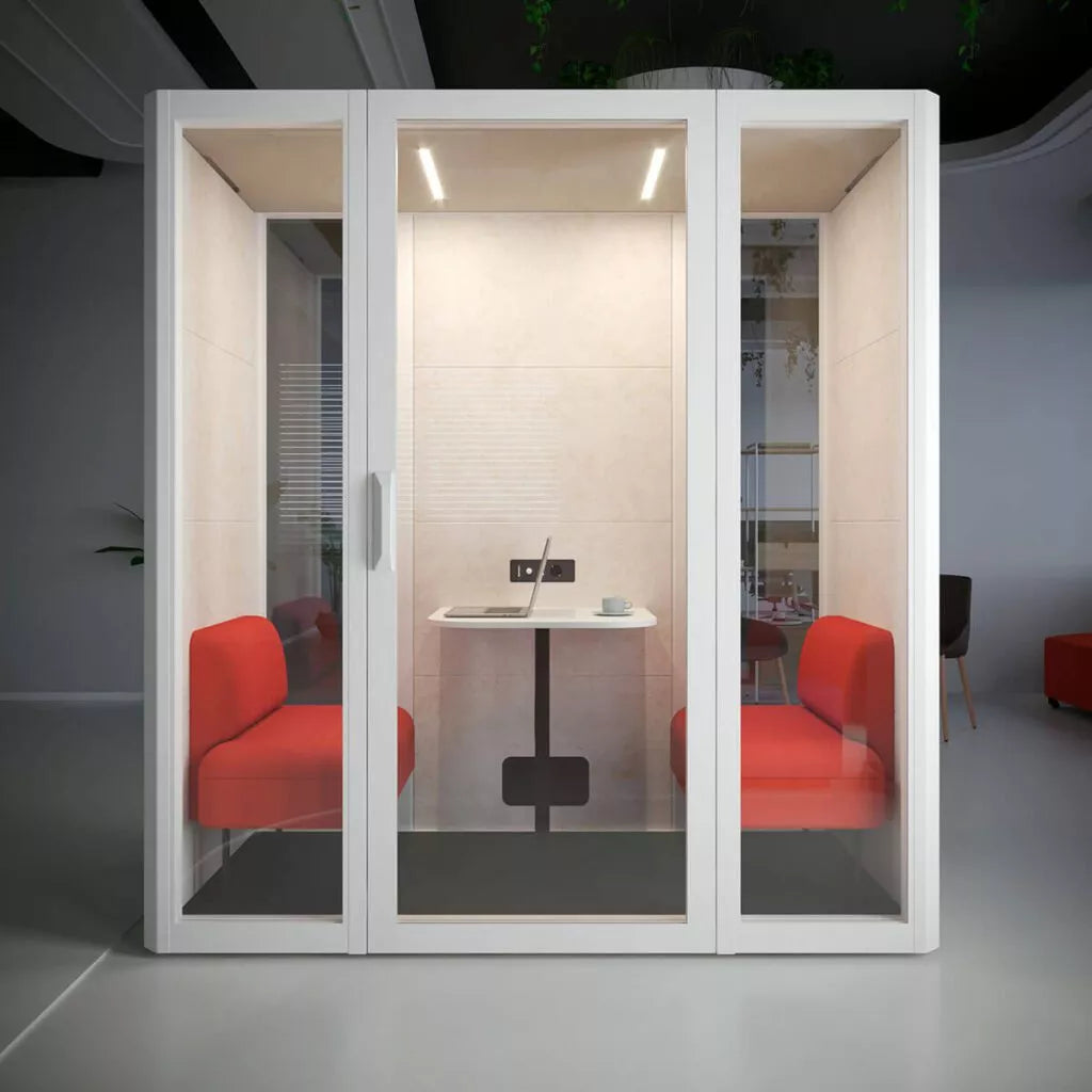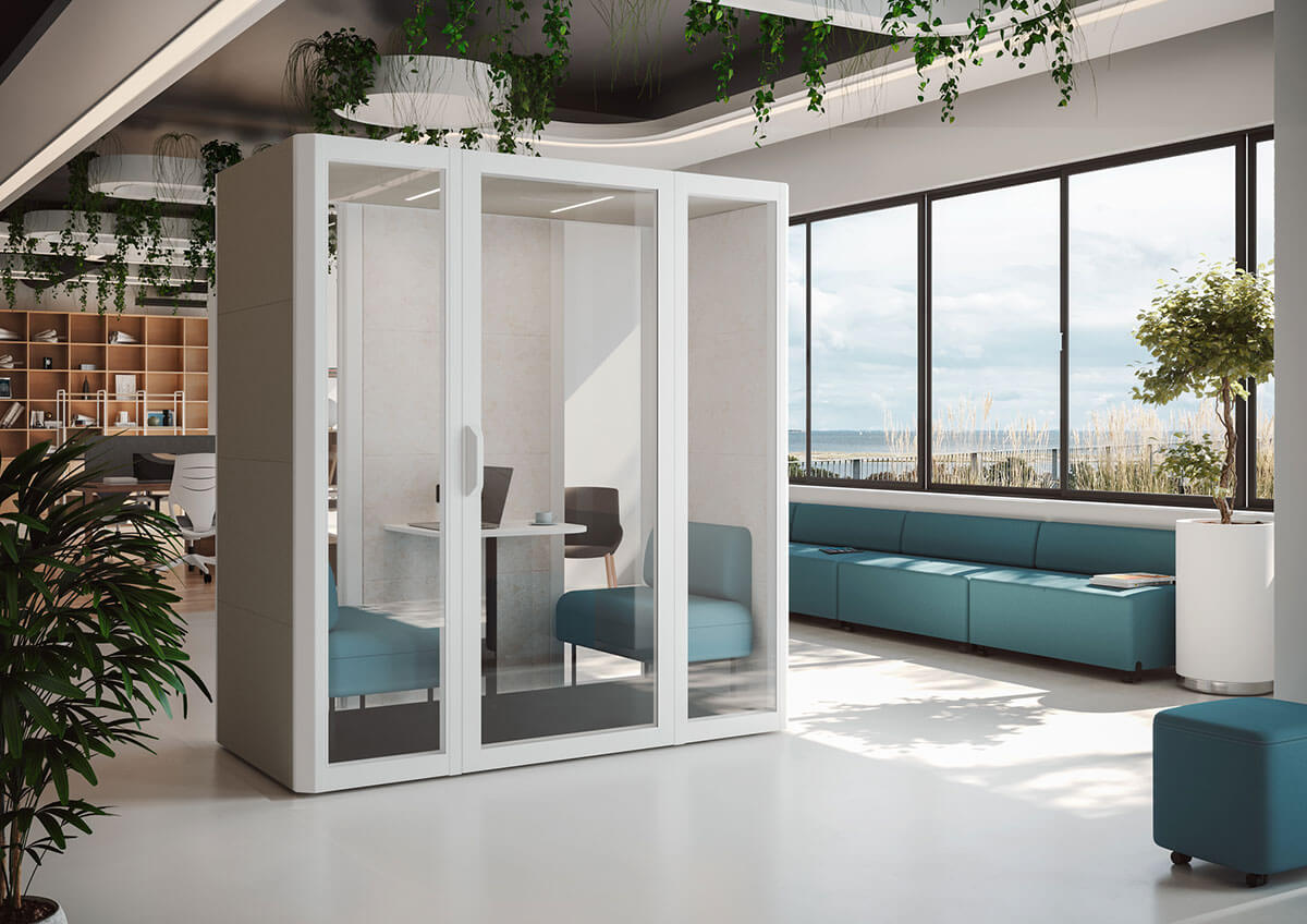 With Qyos booths, you can create enclosed spaces with acoustic insulation that provide comfort and privacy for making calls, concentrating, meeting or finding moments of silence and relaxation.