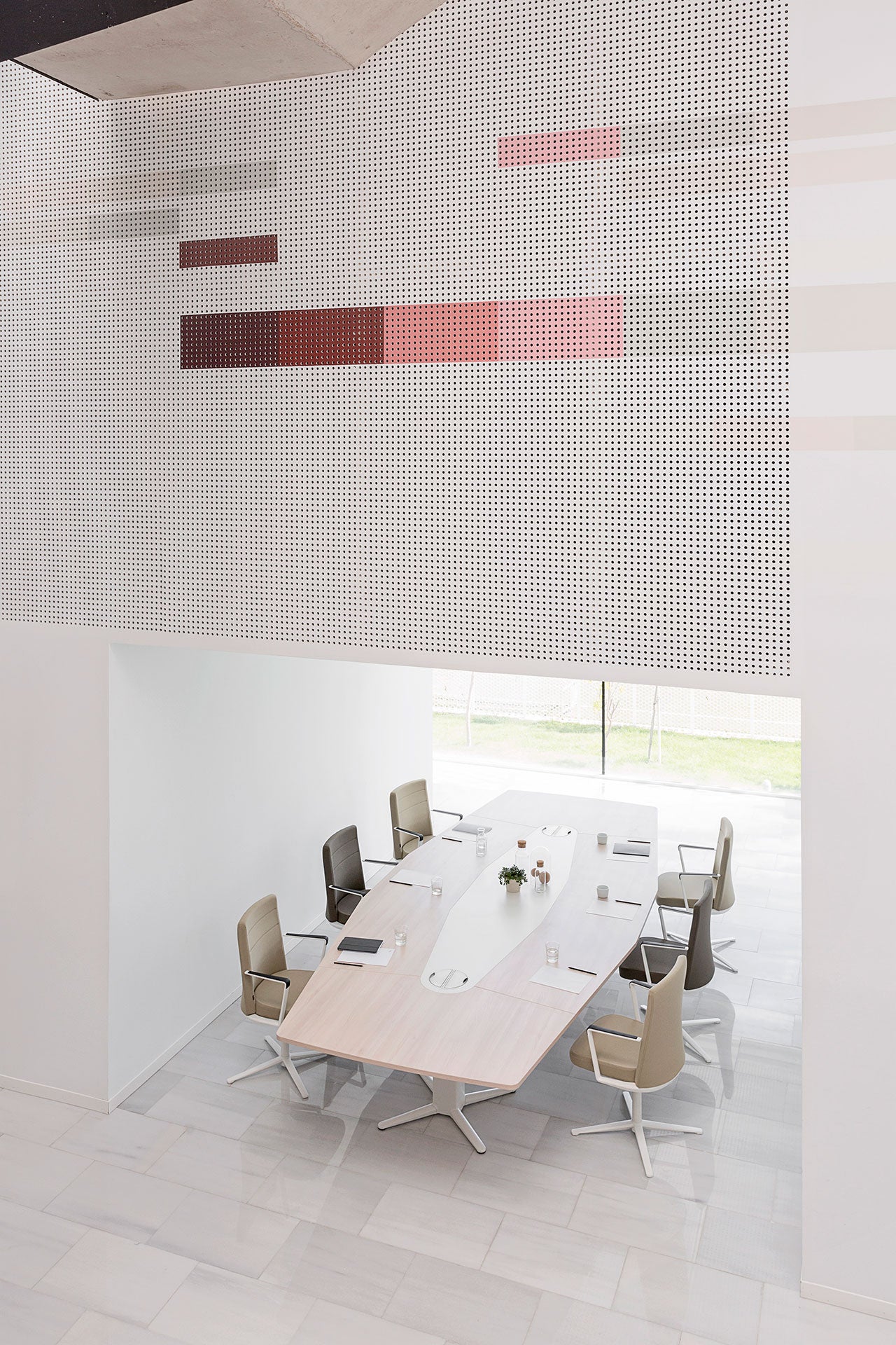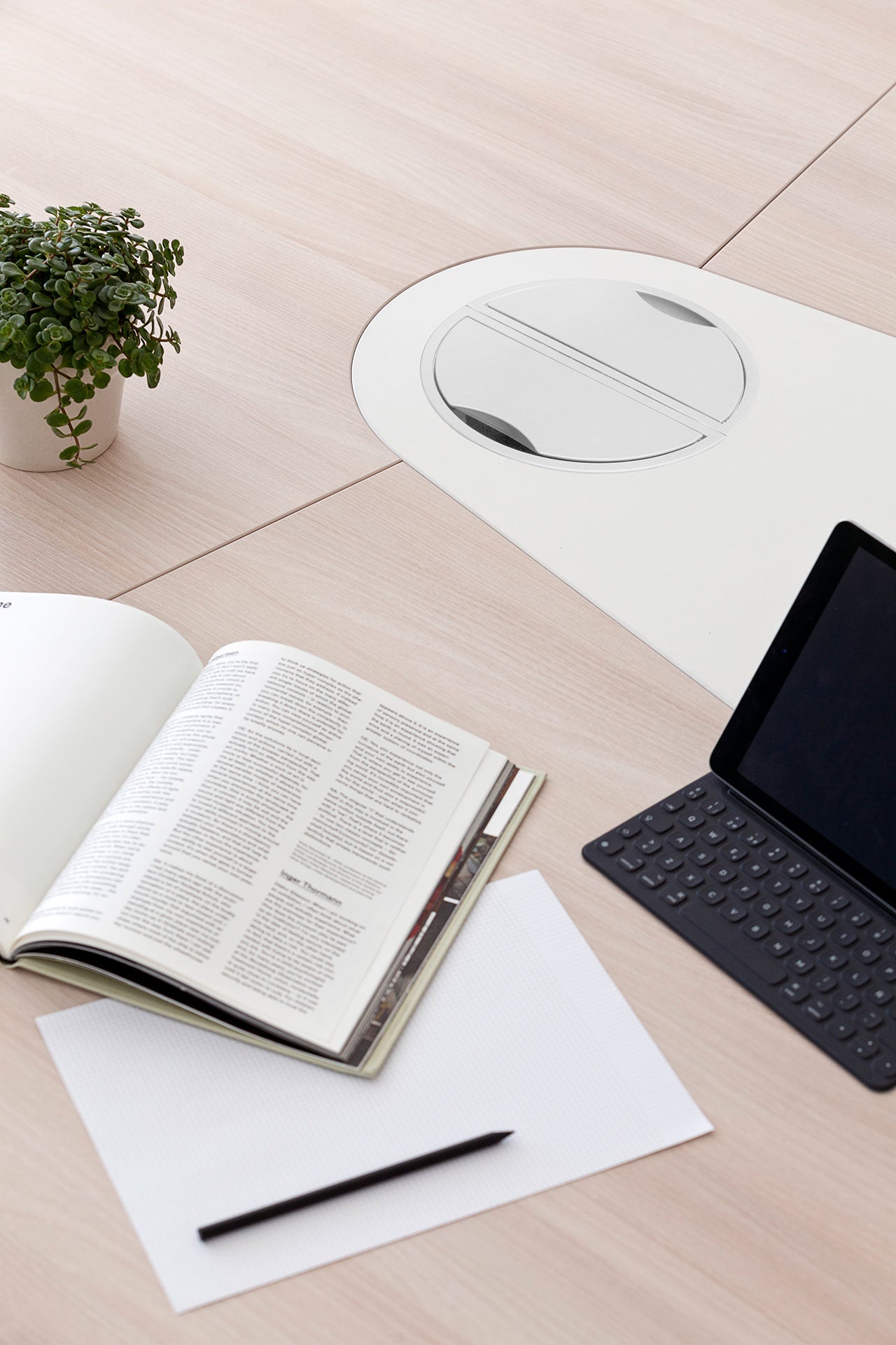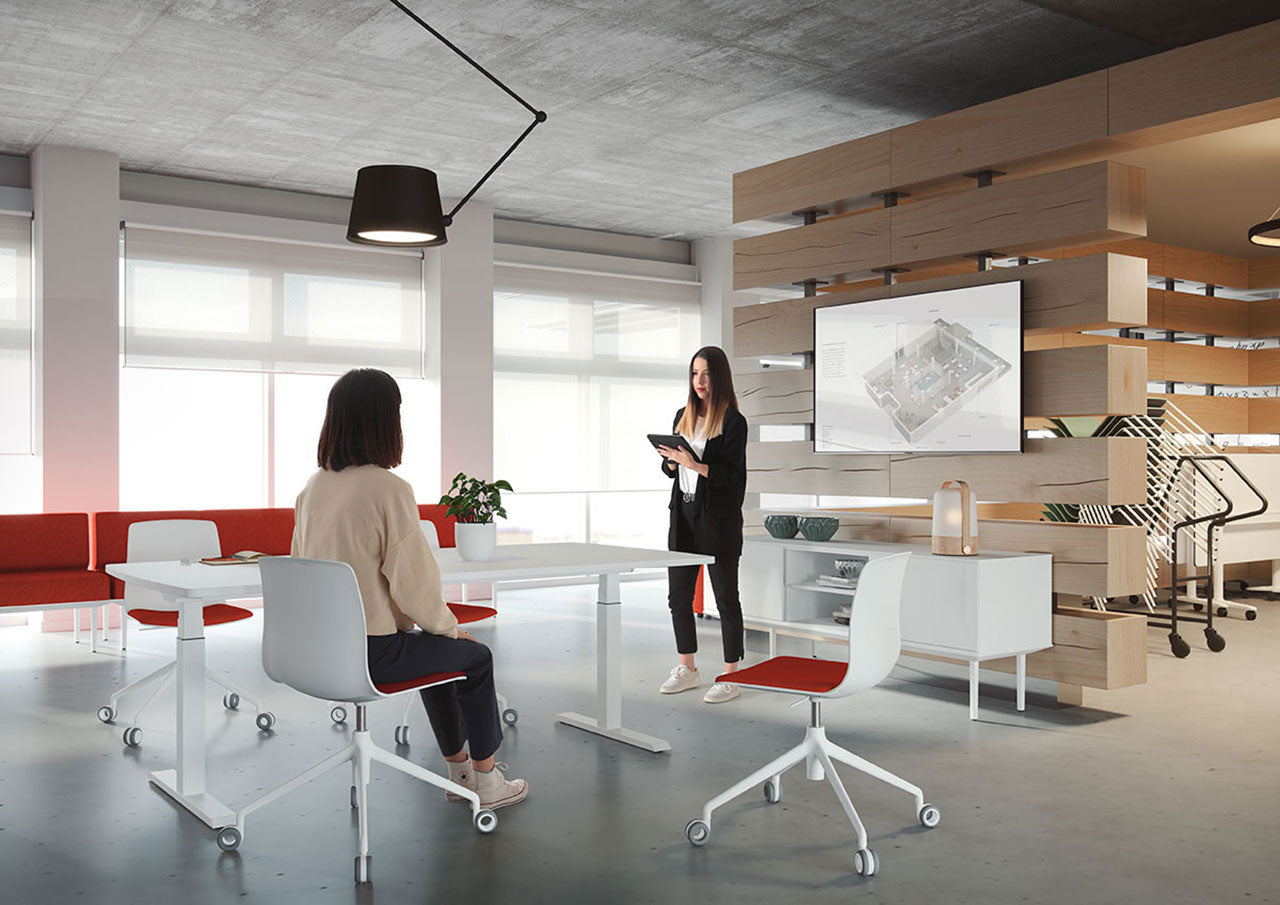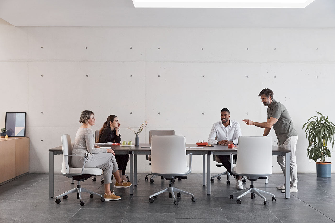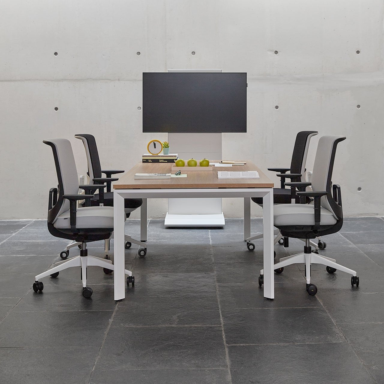 Height-adjustable meeting table that creates versatile office spaces. Individual and multiple workstations, storage systems with built-in tables, support for video conferencing or executive and meeting tables that come in a wide range of shapes and heights.