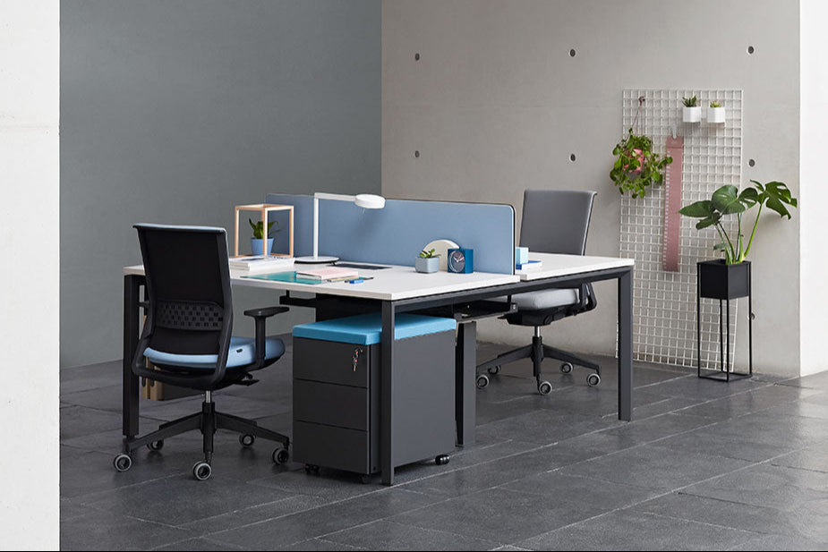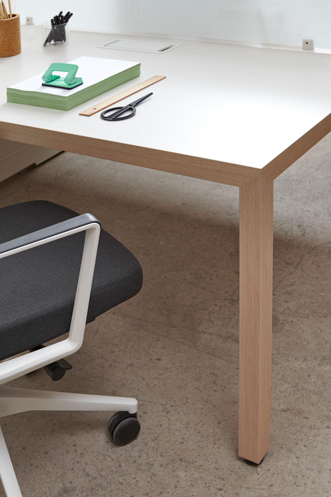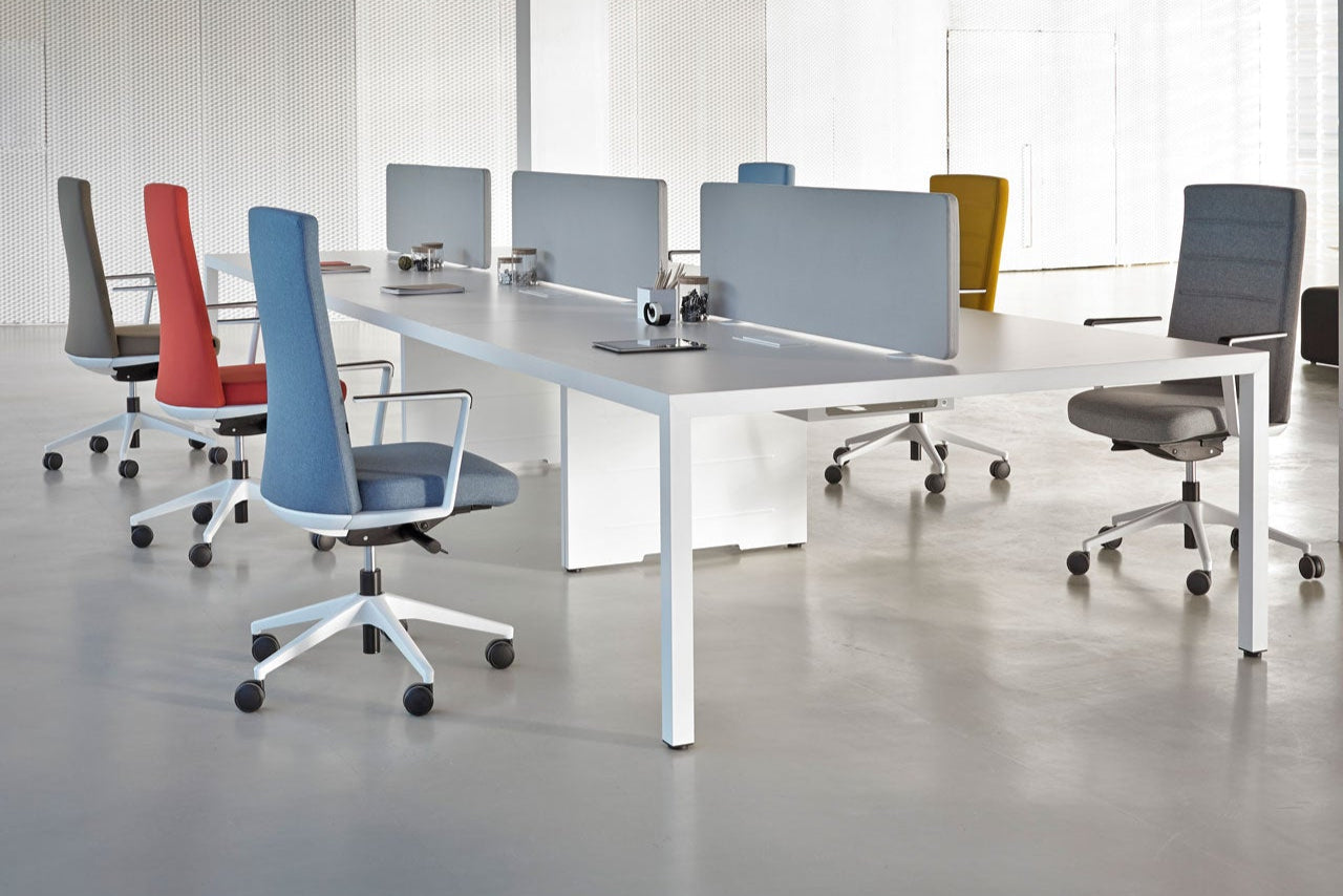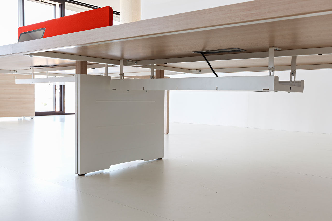 VITAL Plus allows the legs to be recessed and the table tops to be joined together, creating quadruple desks, conference tables or large meeting spaces. Desks can be separated by sound-absorbing partitions.