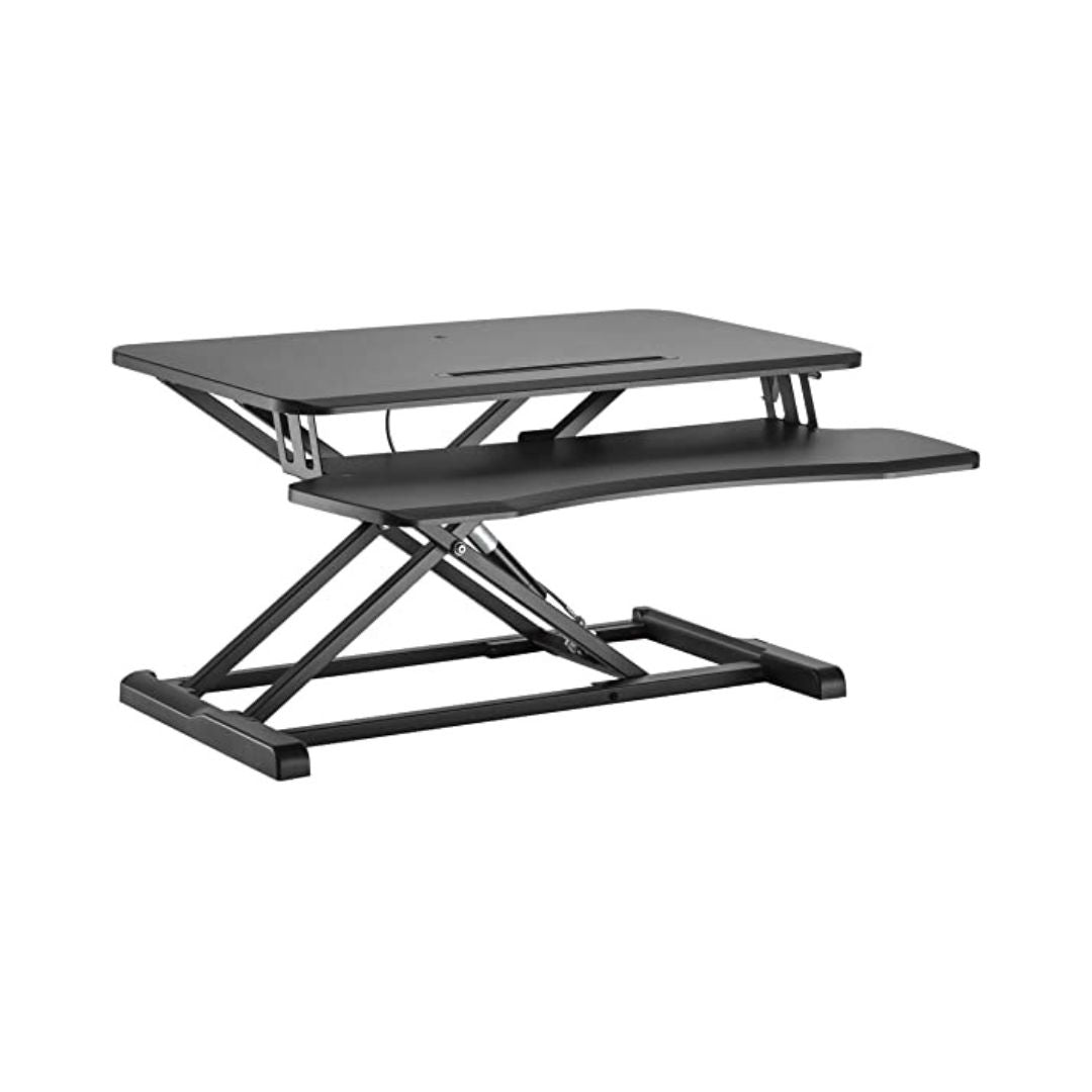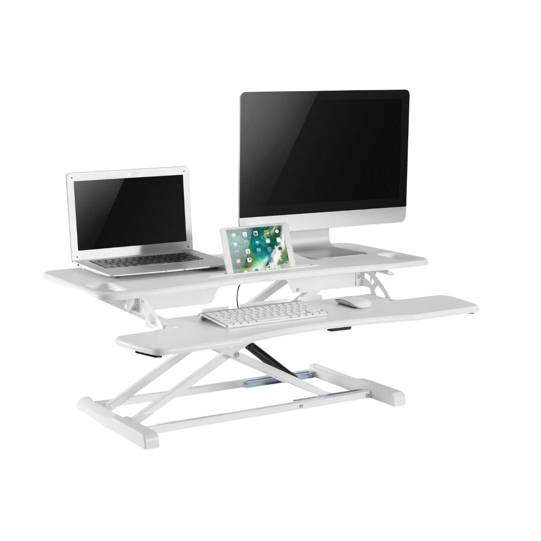 The Sit Stand Converter is a pneumatic desk converter that easily transforms your existing desk into a height-adjustable workstation. Available in black and white, it includes a pre-drilled grommet mount hole for monitor arm compatibility. Ideal for a flexible, ergonomic workspace.